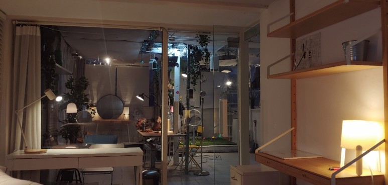 4층 스튜디오 공간이 완성되고 해가 지고 주황 빛이 가득한 조명들을 켜서
